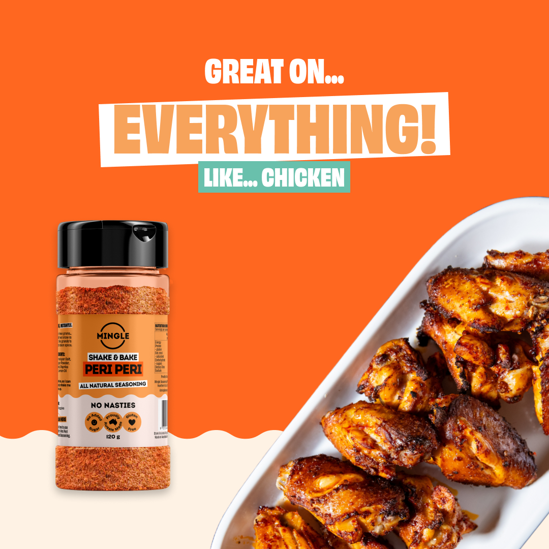 PERI PERI SHAKE & BAKE: Some have nans, some have grans... who are we to judge? All we know is this tastes a whole lot like Grando's favourite Portuguese chicken spice. Mingle’s seasonings were created after realising that current supermarket seasonings had a range of hidden nasties. Mingle's PERI PERI SHAKE & BAKE seasoning tastes great with chicken.