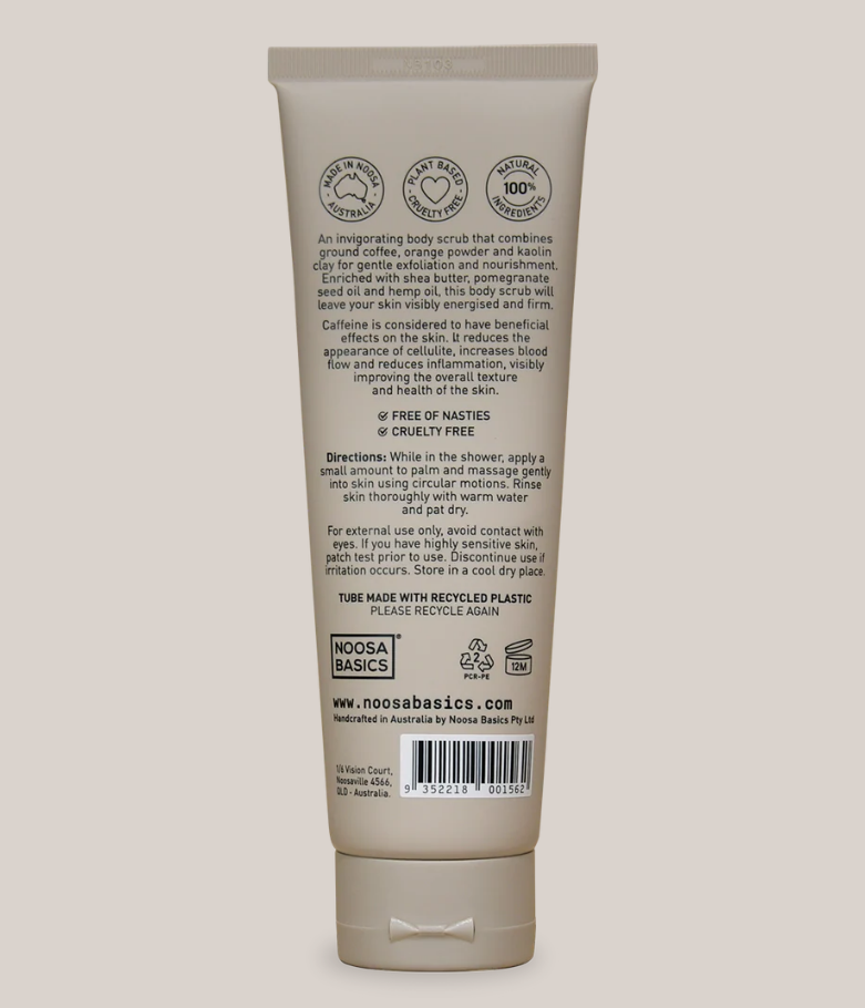 Purified Water, Apricot Kernel Oil, Virgin Coconut Oil*, Shea Butter*, Cocoa Butter*, Cetearyl Olivate, Sorbitan Olivate, Cetyl Alcohol, Pomegranate Seed Oil, Hemp Seed Oil*, Glycerine, (Benzyl Alcohol, Salicylic Acid, Sorbic Acid), Ground Coffee Beans, Australian Kaolin Clay, Orange Sweet Peel Powder, Vitamin E*, Grapefruit Essential Oil, Coconut Flavour* *Certified Organic ∞ Derived from Coconut Oil